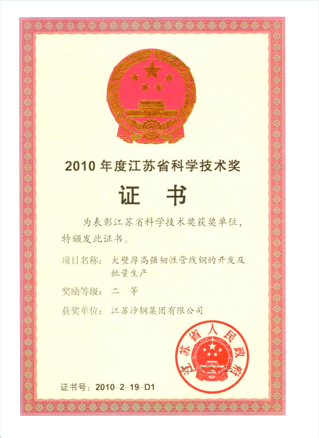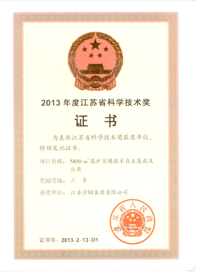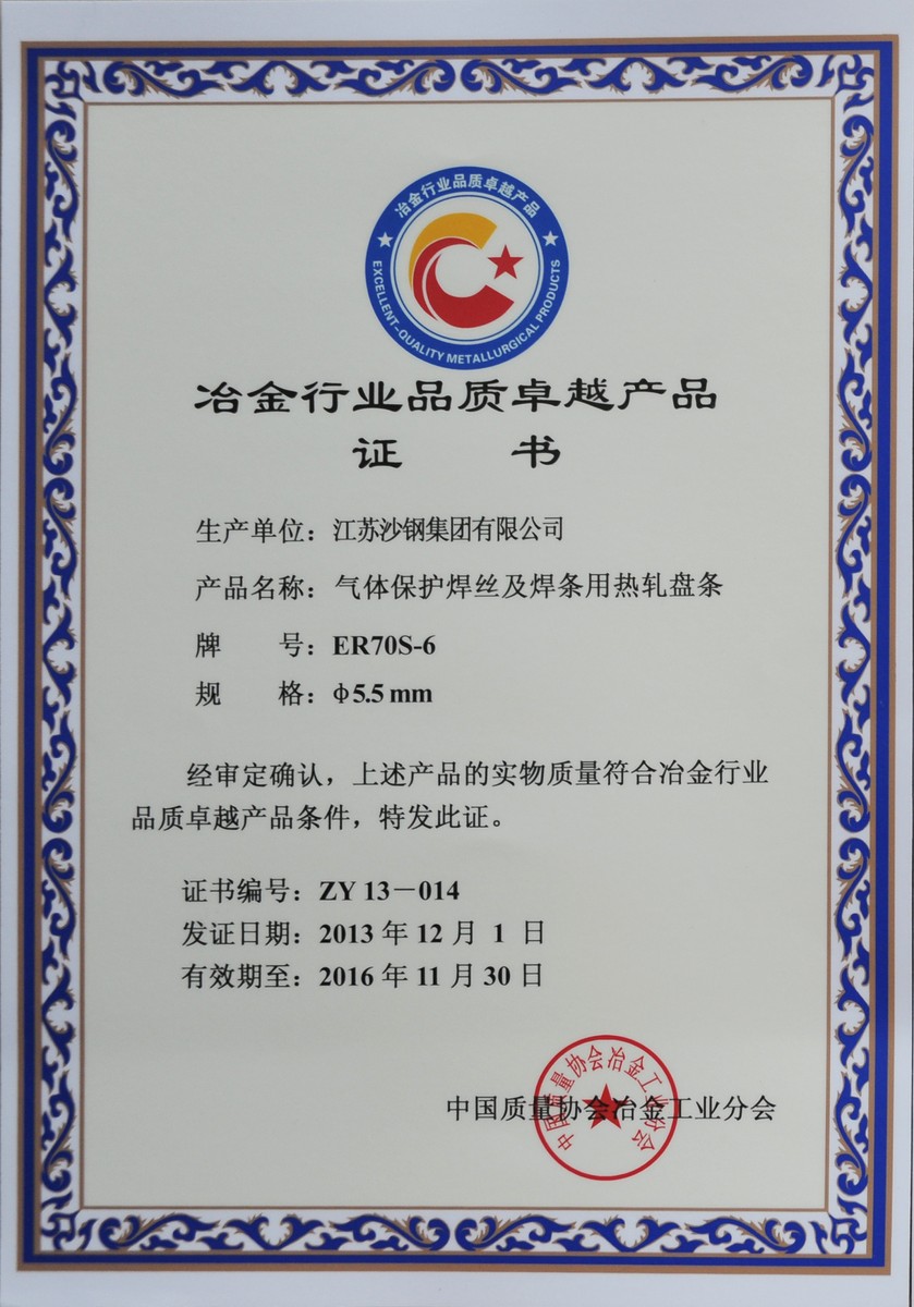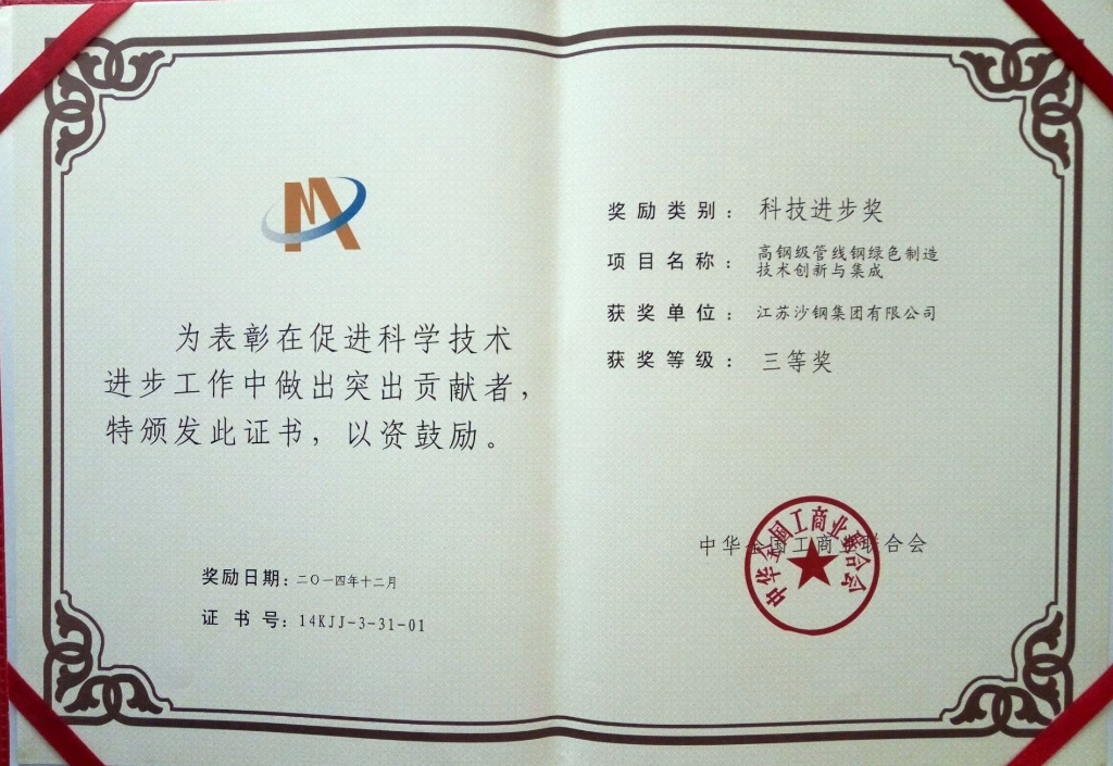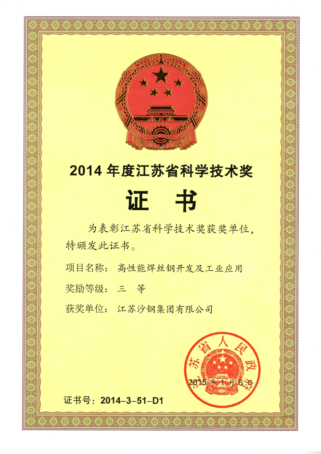 2014年度江苏省科学技术奖三等奖——高性能焊丝钢开发及工业应用