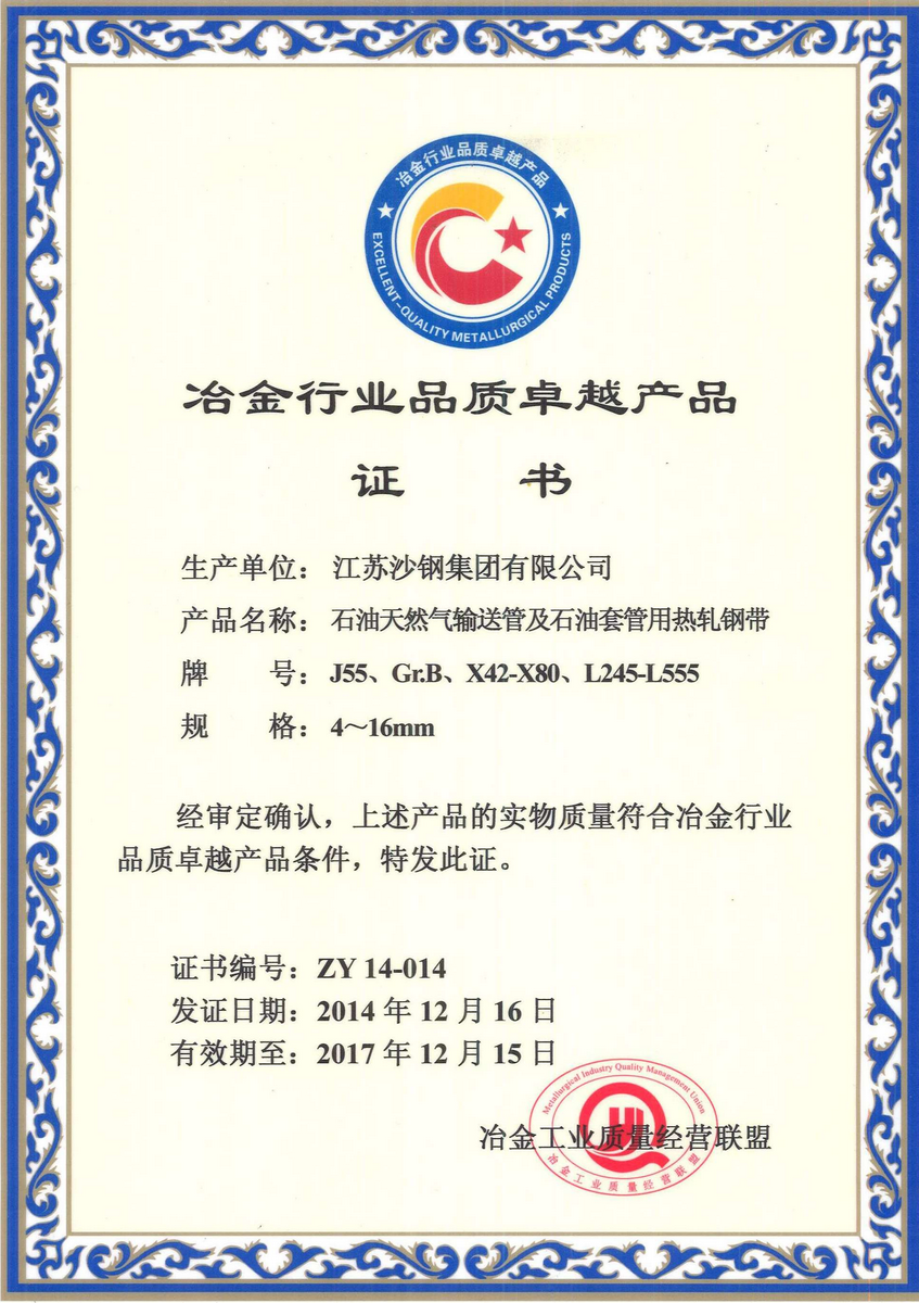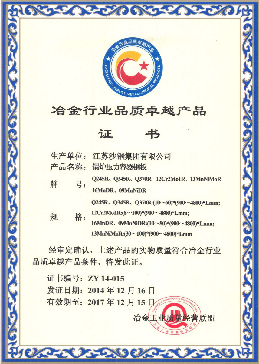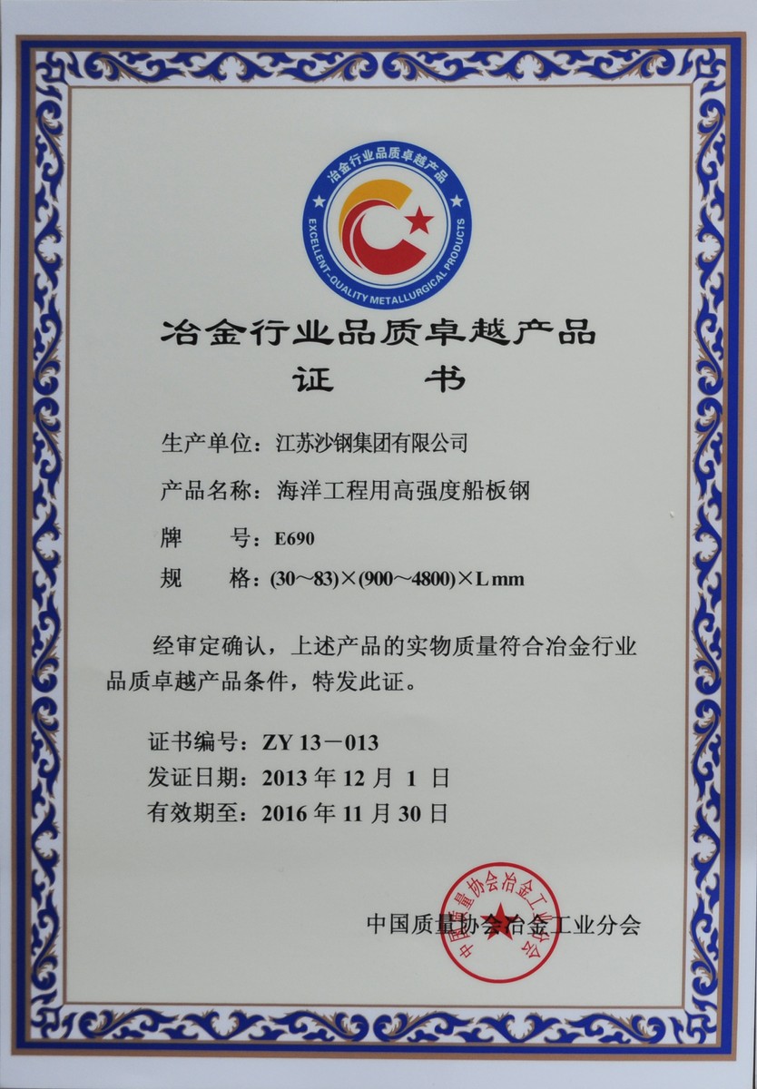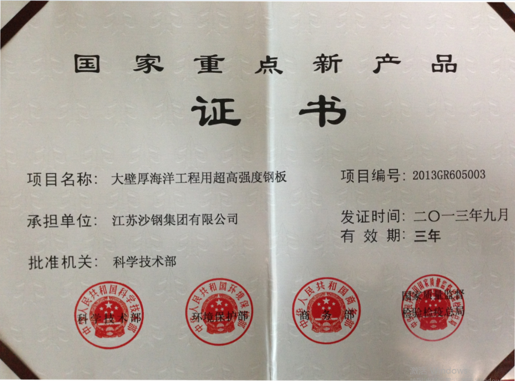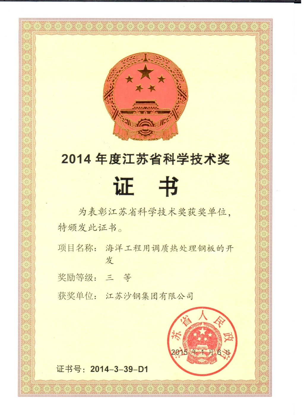 2014年度江苏省科学技术奖三等奖——海洋工程用调质热处理钢板的开发