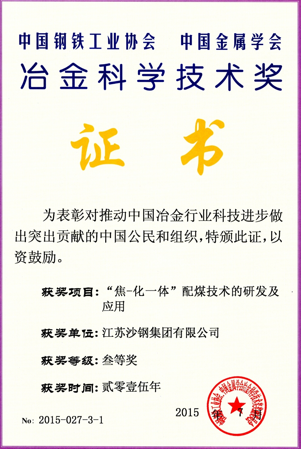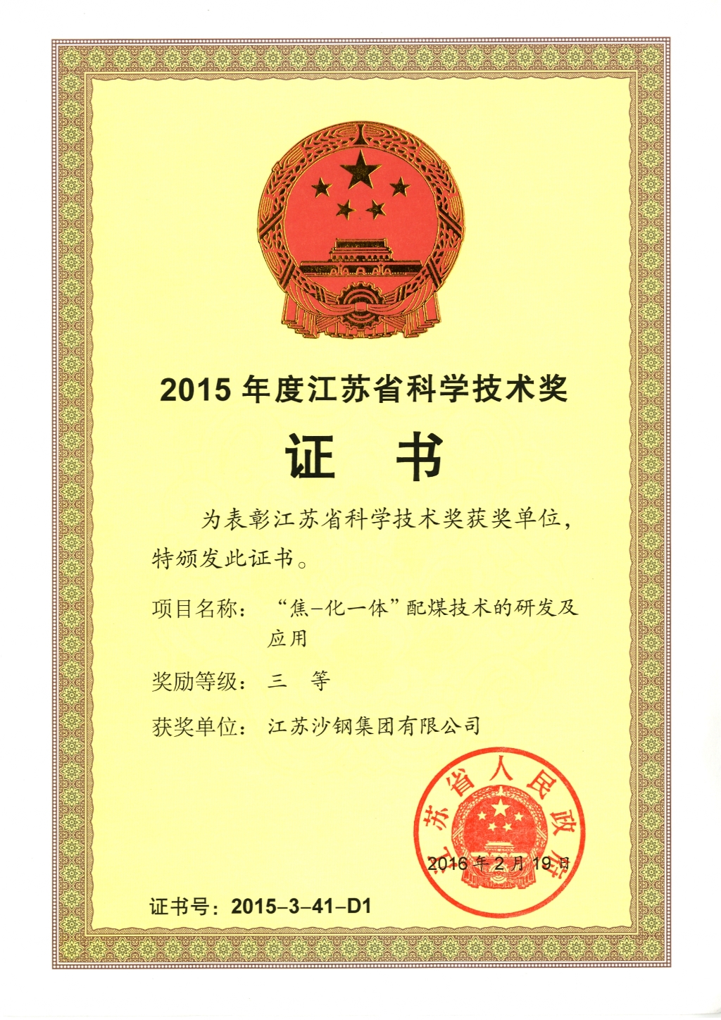 2015年度江苏省科学技术奖三等奖——焦化一体配煤技术的研发及应用