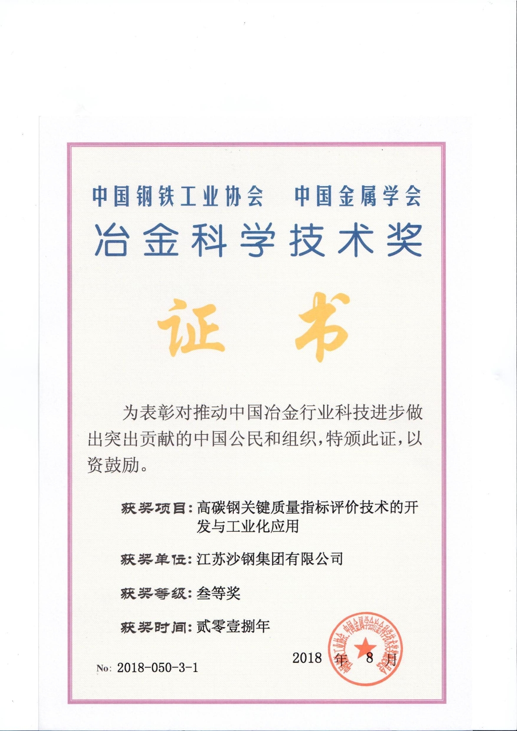 冶金科学技术奖三等奖——高碳钢关键质量指标评价技术的开发与工业化应用