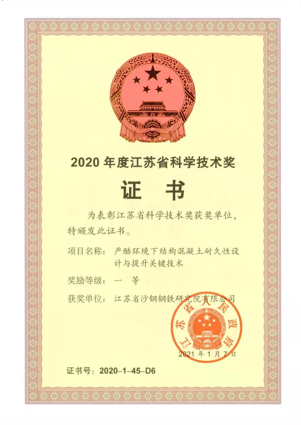 2020年度江苏省科学技术奖——严酷环境下结构混凝土耐久性设计与提升关键技术