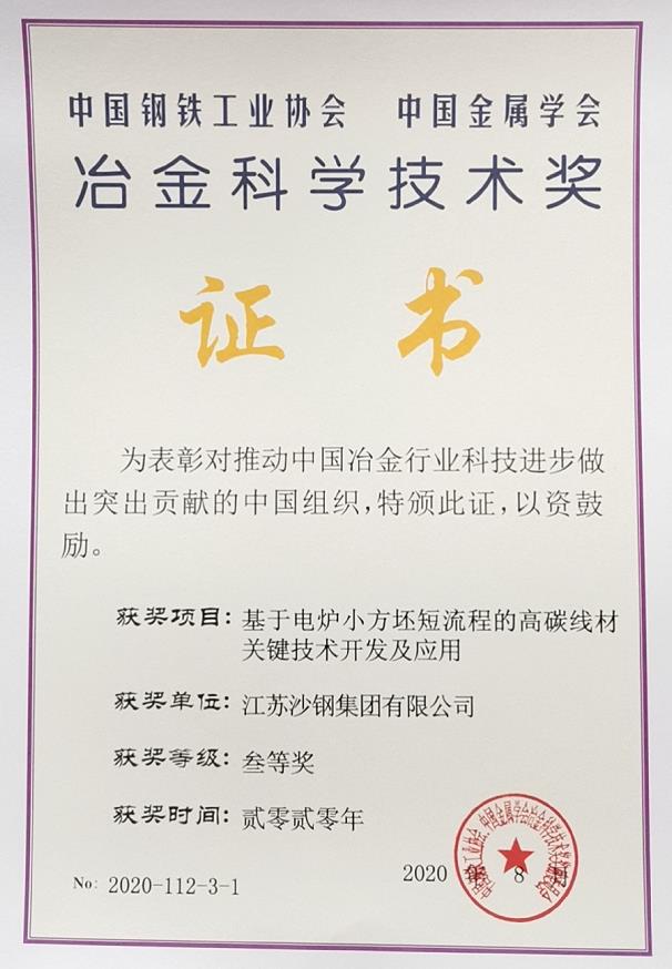 2019年度江苏省科学技术奖三等奖——优质特殊棒线材关键冶炼技术开发及产业化应用